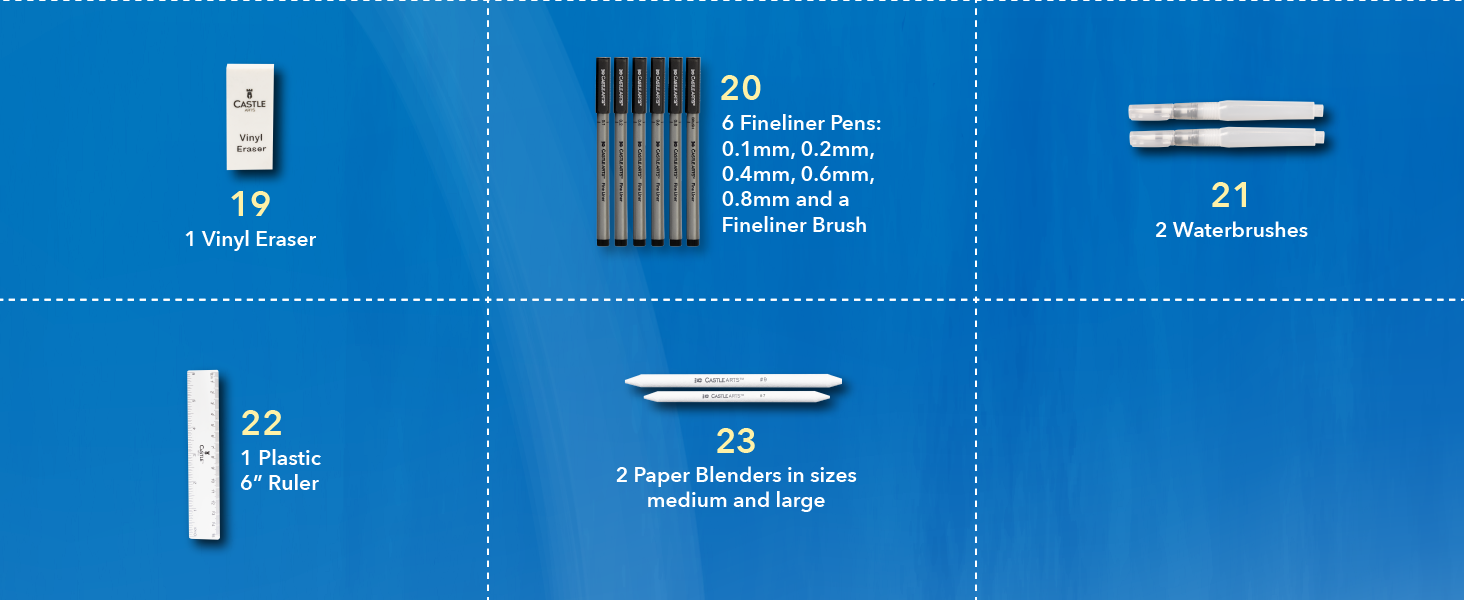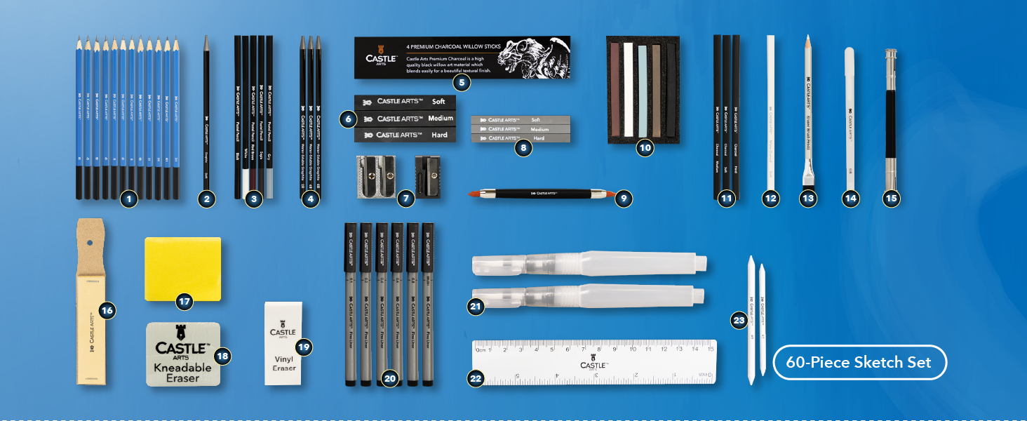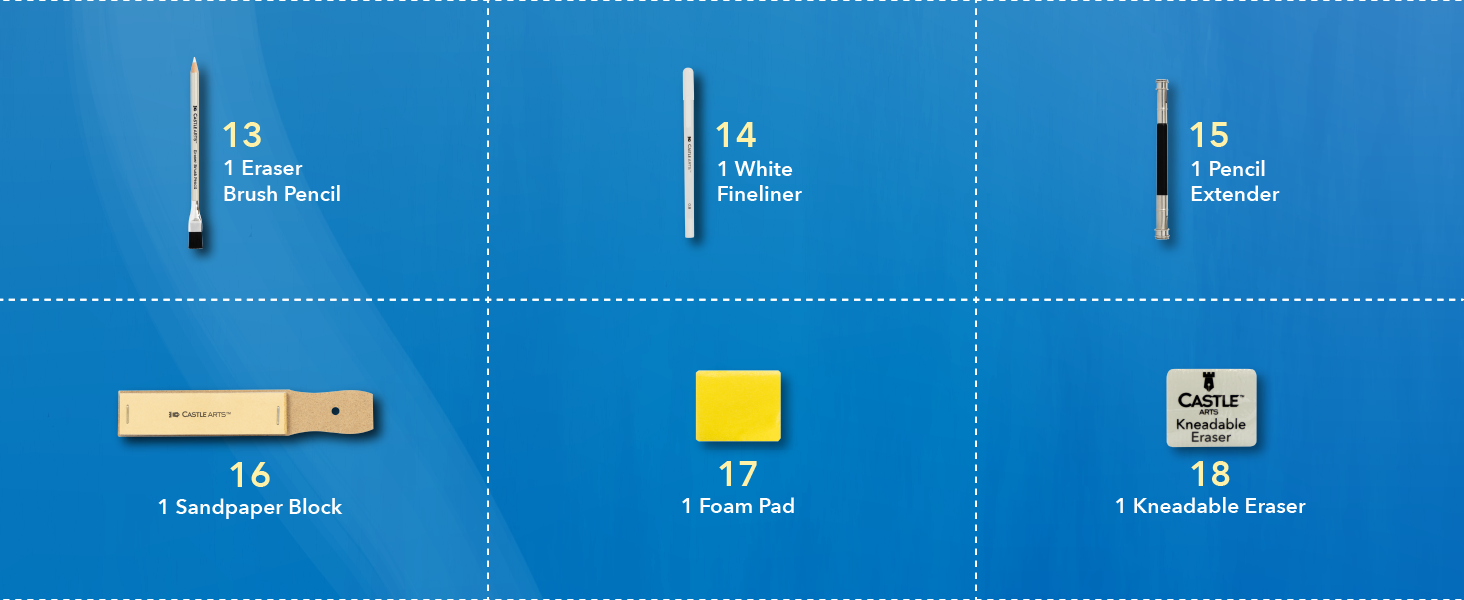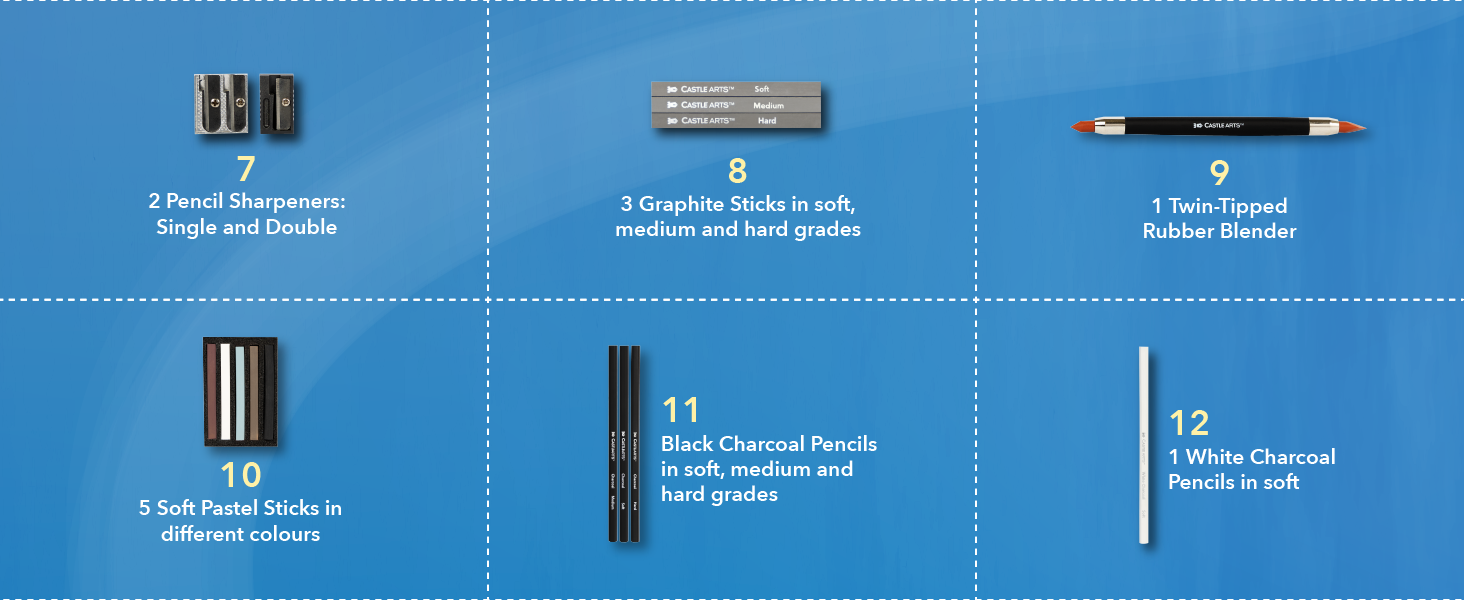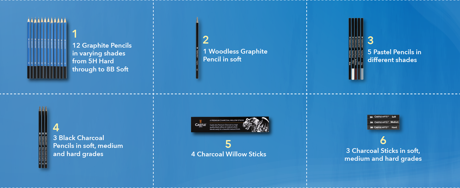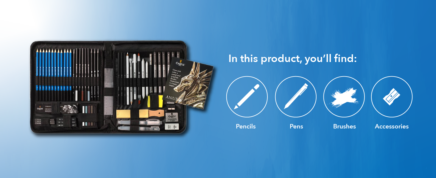 FORMIDABILE POTENZA DI FUOCO A cura di artisti interni per disegnatori - esperti e principianti: matite di grafite + bastoncini, matite di carbone + bastoncini, matite pastello + bastoncini, matite idrosolubili + pennelli ad acqua, penne a punta fine più frullatori, gomme e strumenti.