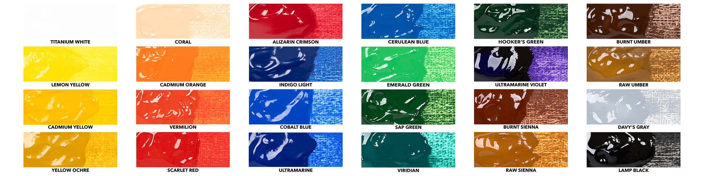 Zestaw zawiera 24 tubki o pojemności 12 ml. Kolory zawarte w tym zestawie to: biel tytanowa, żółć cytrynowa, ochra żółta, cynober, czerwień karminowa, zieleń viridian, umber surowy, błękit kobaltowy, sienna palona, czerń lampowa, błękit ultramarynowy i zieleń Hookera, odcień cielisty, żółć średnia, pomarańczowy, szkarłat, zieleń szmaragdowa, zieleń soczysta, błękit cerulean, błękit ftalowy, fioletowy, sienna surowa, umber palona i szary.