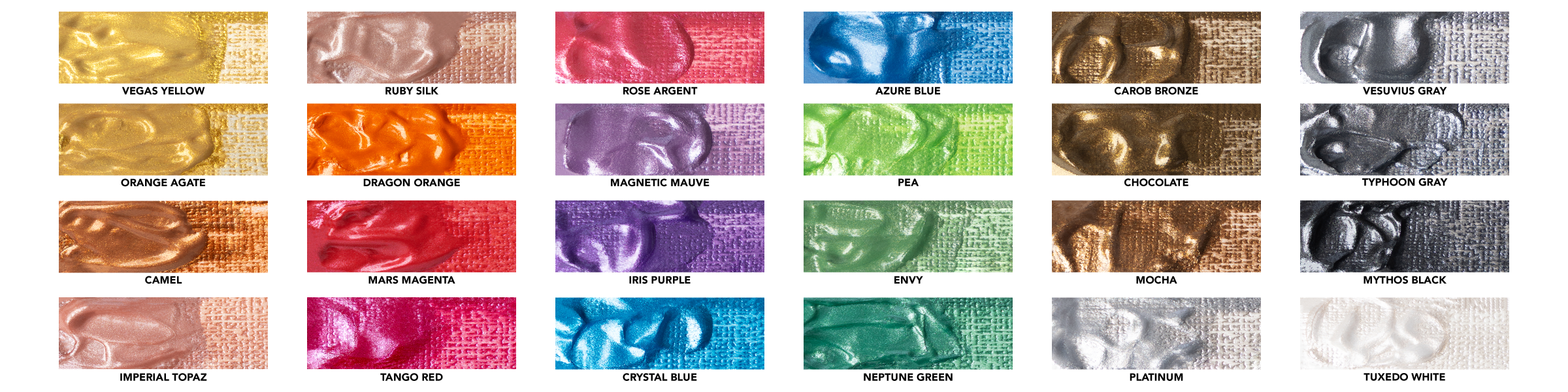DOŁĄCZ DO GLITTERATI Opracowane przez naszych artystów tak, aby imitowały błyszczący metal, wysoce pigmentowane, bogato rozprowadzane farby akrylowe w kolorach takich jak Honey Bronze i Magnetic Mauve wyniosą Twoją sztukę na eteryczny wymiar.